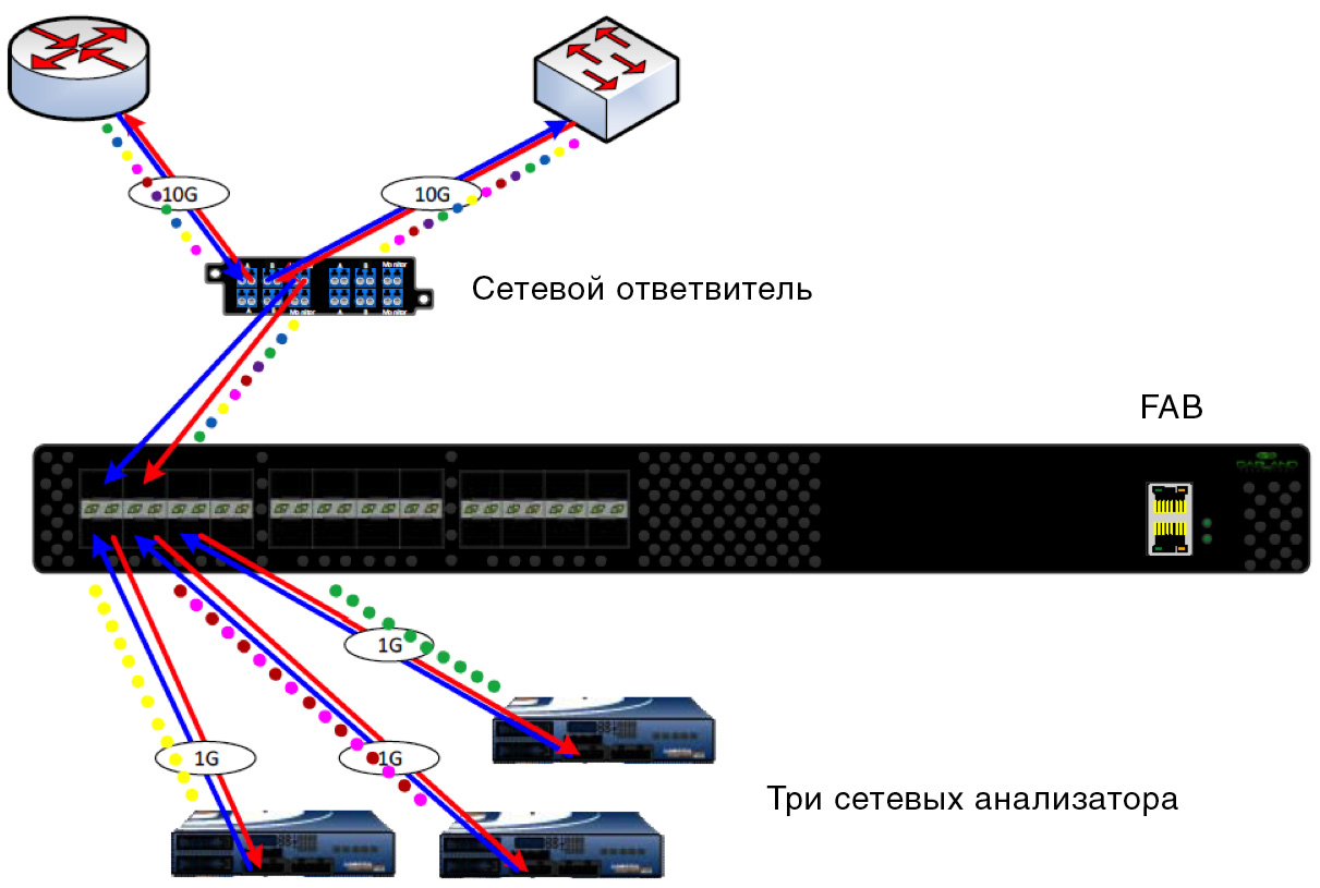 Фильтрующие и агрегирующие балансировщики нагрузки (Filtering Aggregating Load Balancers, FAB) компании Garland — это брокеры сетевых пакетов, являющиеся идеальными средствами подачи потоков трафика из одного или более источников на несколько средств мониторинга или обеспечения информационной безопасности. Поскольку каждый порт устройства FAB поддерживает все его функции и является полностью конфигурируемым, данное устройство обеспечивает максимальную гибкость контроля трафика. Все модели устройств FAB выполнены в небольшом корпусе (высотой 1U) с двумя блоками питания переменного или постоянного тока, заменяемыми в «горячем» режиме. Отличаются модели числом и типом портов: у всех моделей есть порты SFP/SFP+ (8, 16, 24, 32 или 48), отдельные модели также имеют медные порты Возможно конфигурирование различных видов связи между портами устройства FAB: один ко многим, многие к одному, многие ко многим. Так, устройство FAB можно использовать для равномерного распределения контролируемого потока 10G по нескольким сетевым анализаторам с портами 1G (см. рисунок). ![]() Основные характеристики